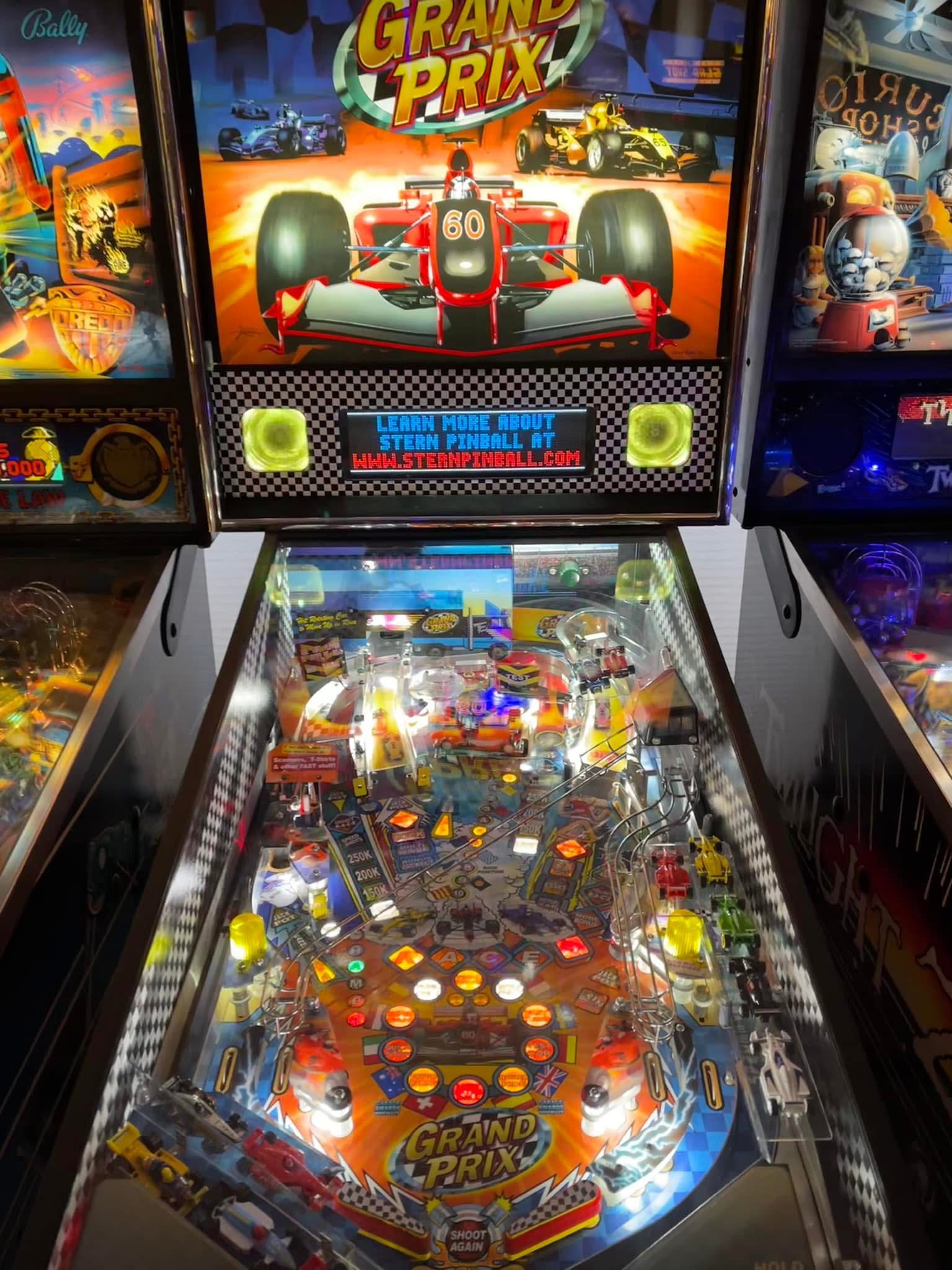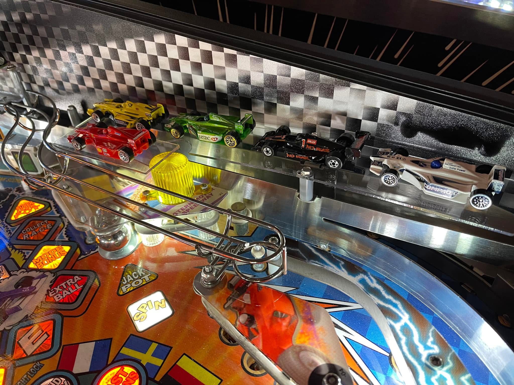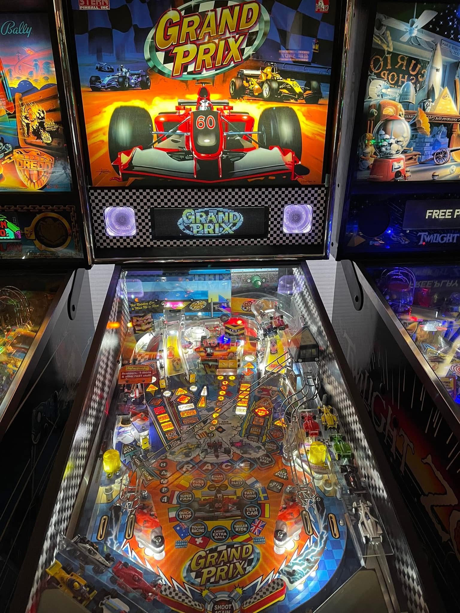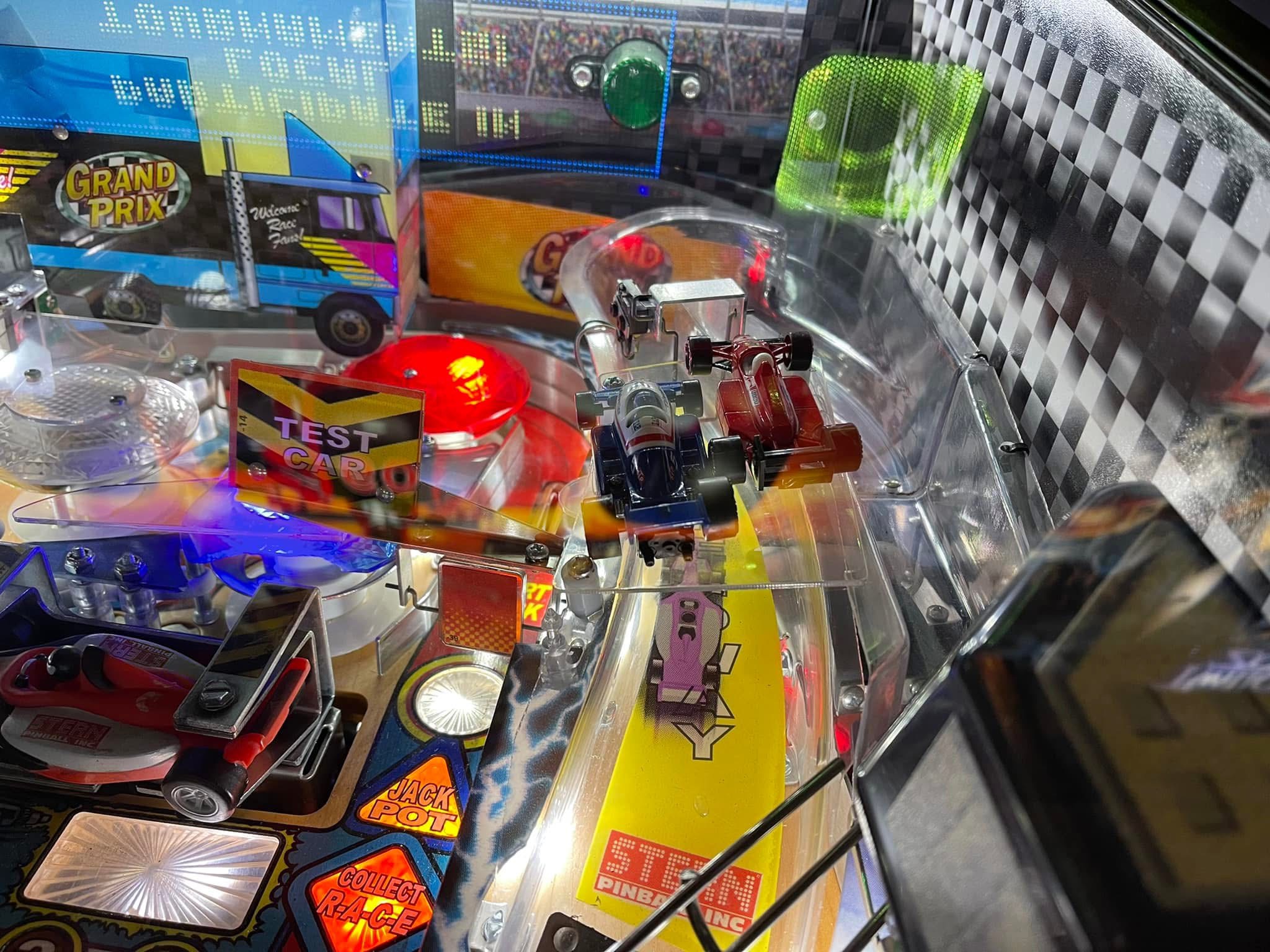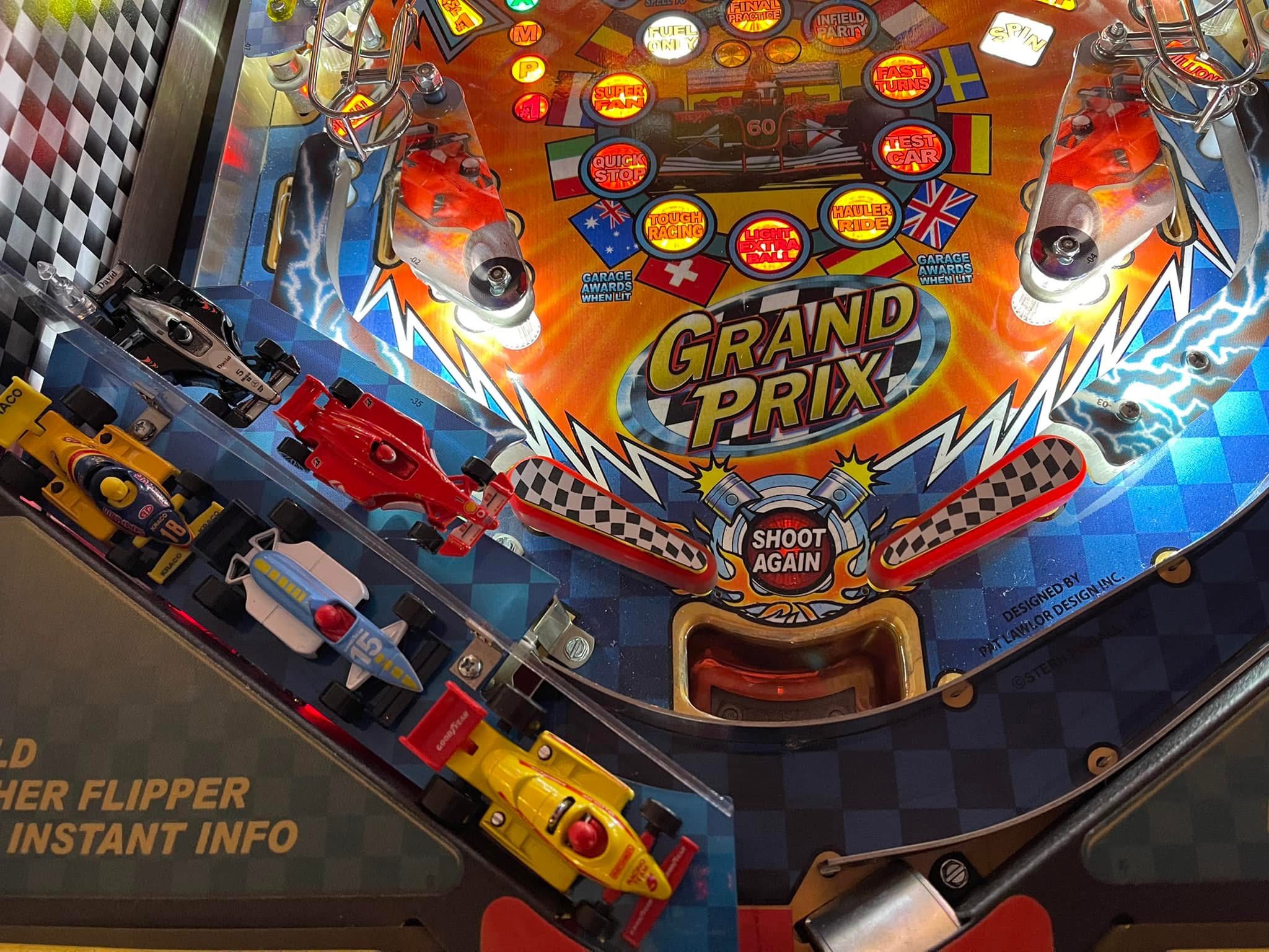 Here is a very rare “especially in the United States” Grand Prix pinball machine by Stern. It is in perfect working order and looks fantastic. It is totally blinged out with 100% all LED’s, art blades, a mix of Hot Wheels and Matchbox Cars, added LED post lights, upgraded sound system, shaker motor, LED ColorDMD, and more. There were only approximately 600 of these made and they were all intended for the European market. So many amazing shots and almost all shots are makable with either flipper.