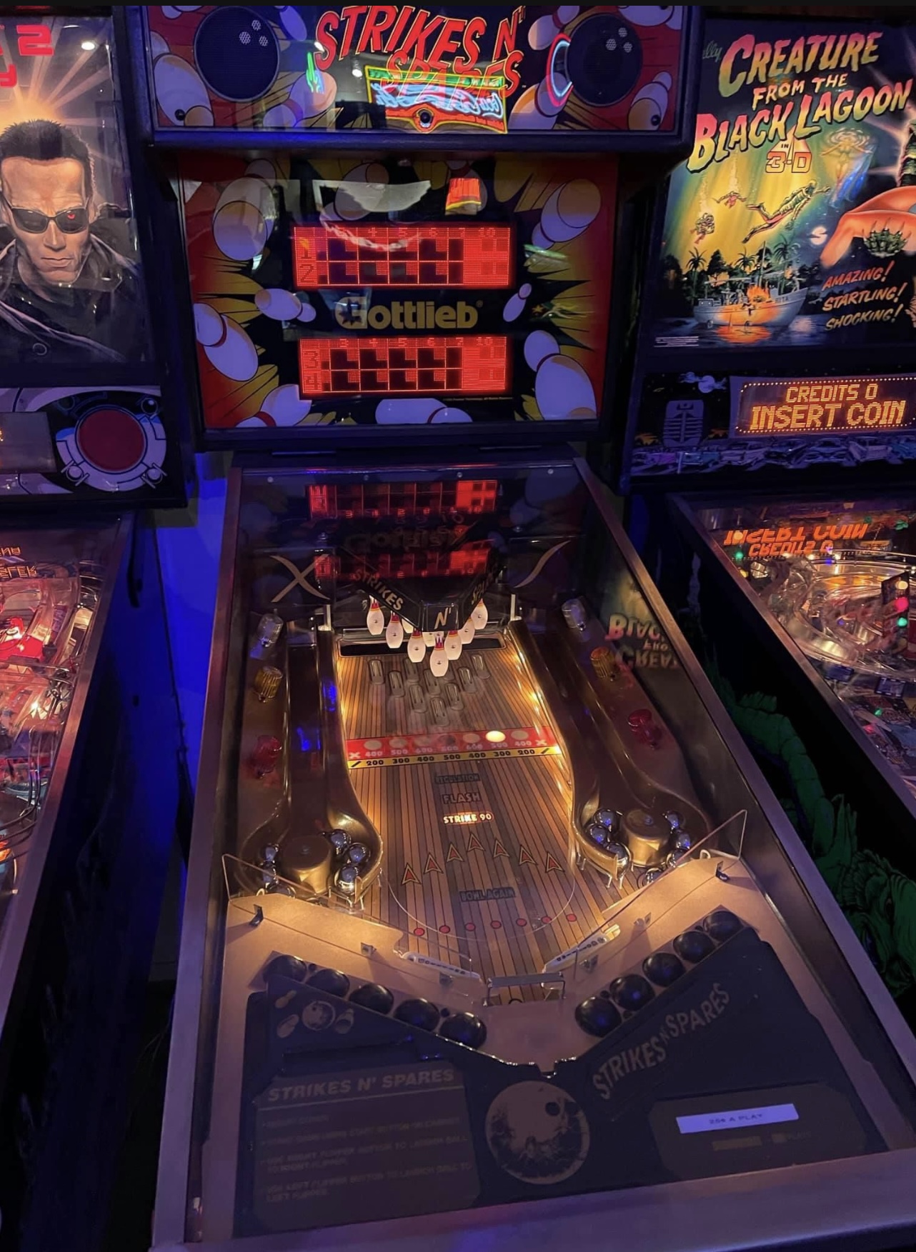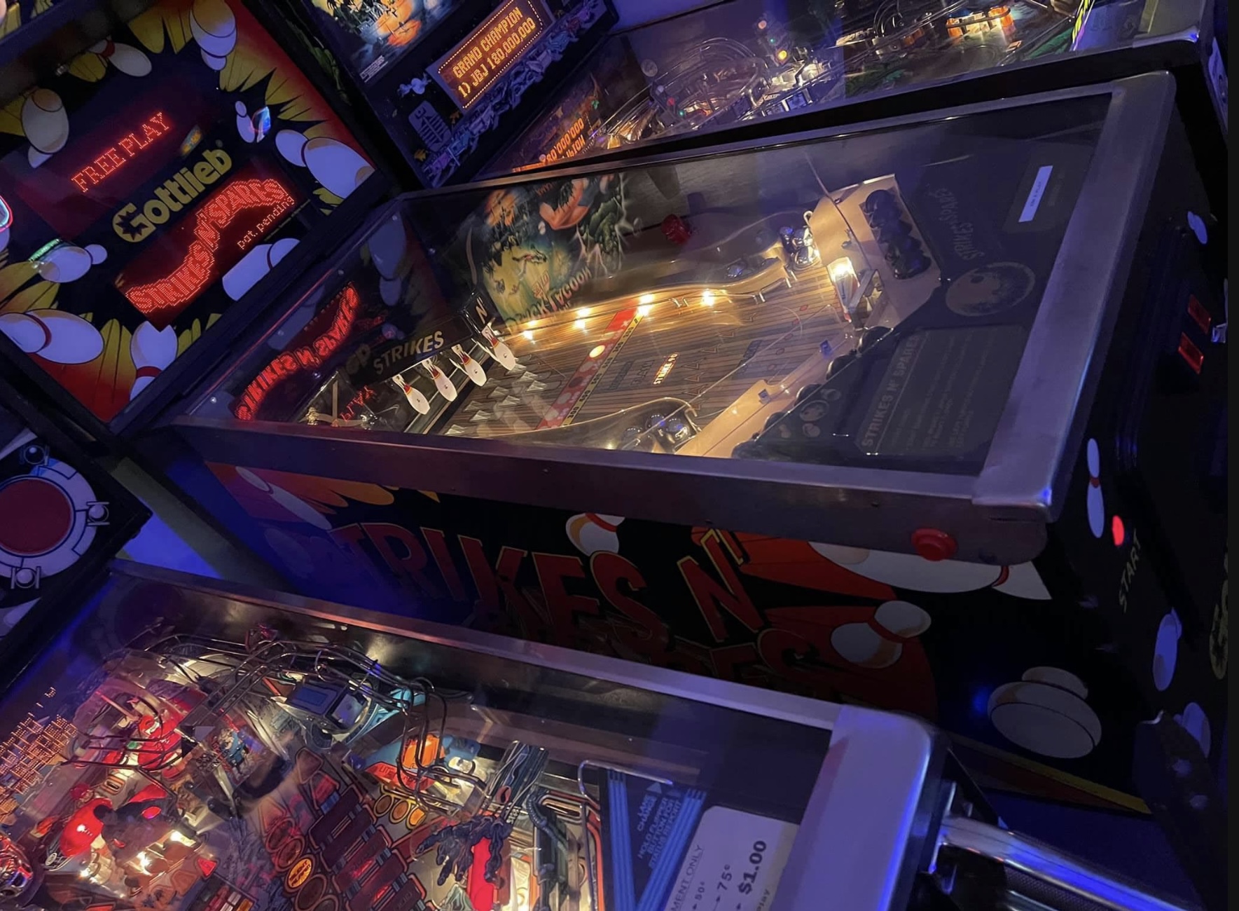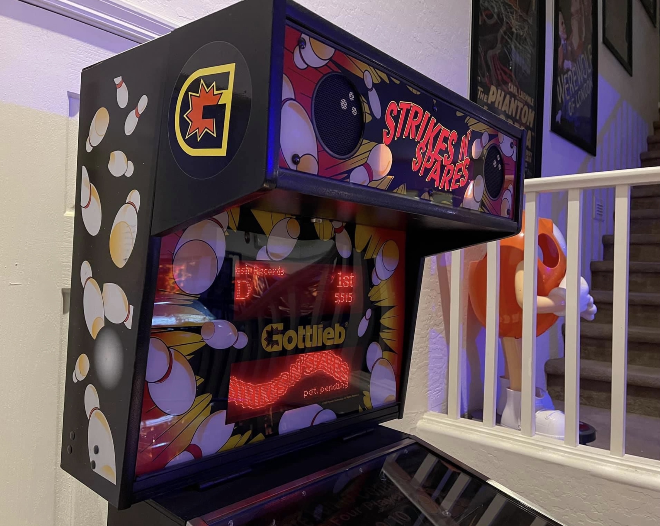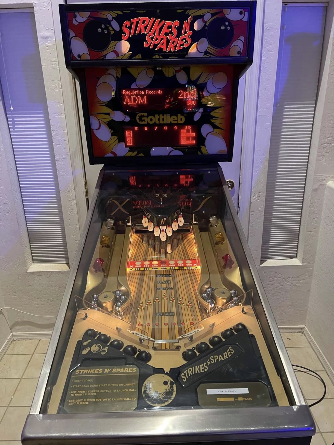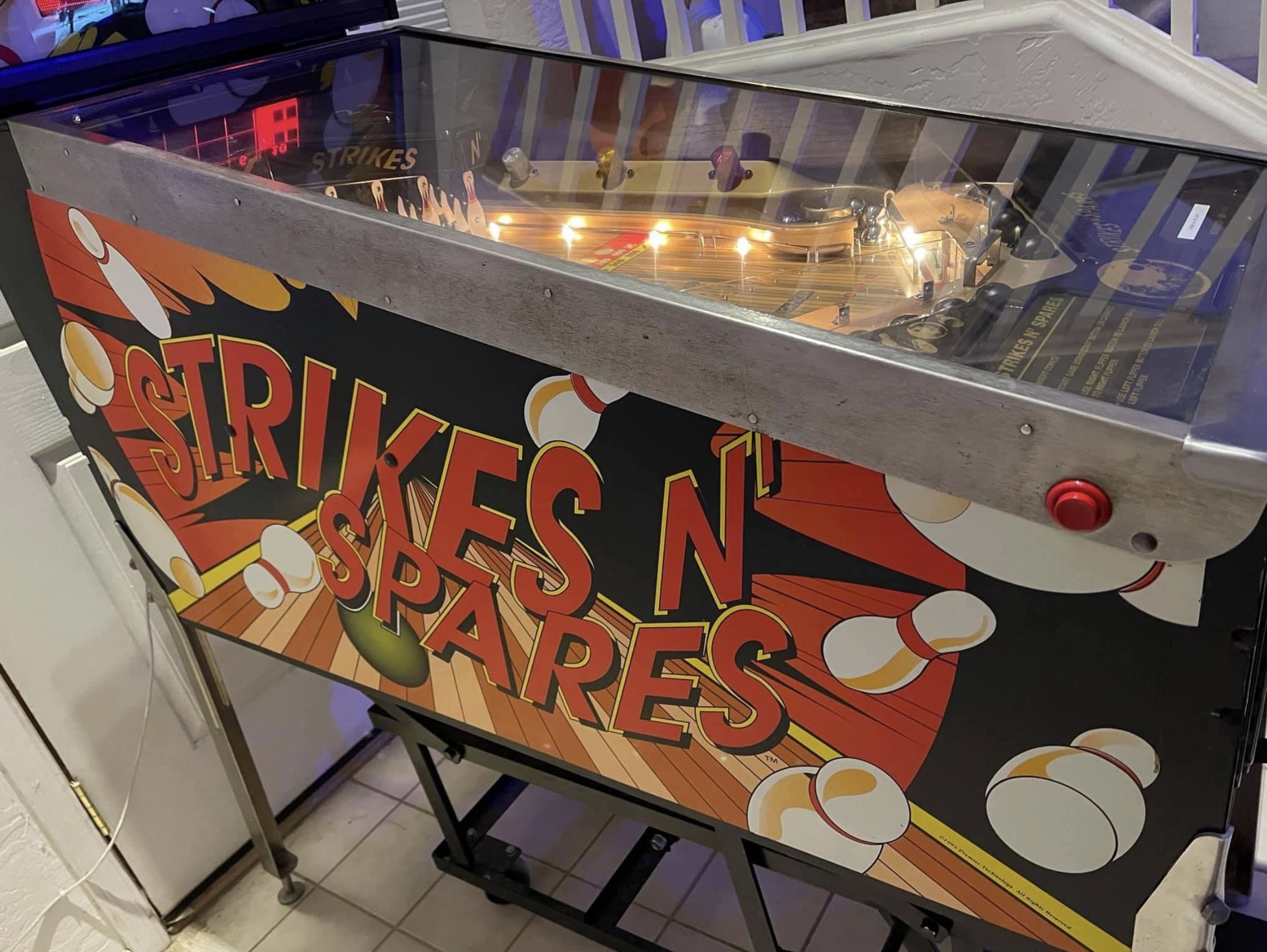 Strikes N’ Spares bowling game. In what looks like a standard pinball cabinet, this is actually a bowling game that plays like pinball. Three game modes, regulation, flash, or strike 90. Absolutely addictive game, can play 1 to 4 players. We currently have a second unit of this game out on location and players can’t get enough of it. Can be set to free-play or take coins. Comes with both the standard silver balls or black bowling style balls, your choice which to use. Looks great and plays perfectly, come give it a try.