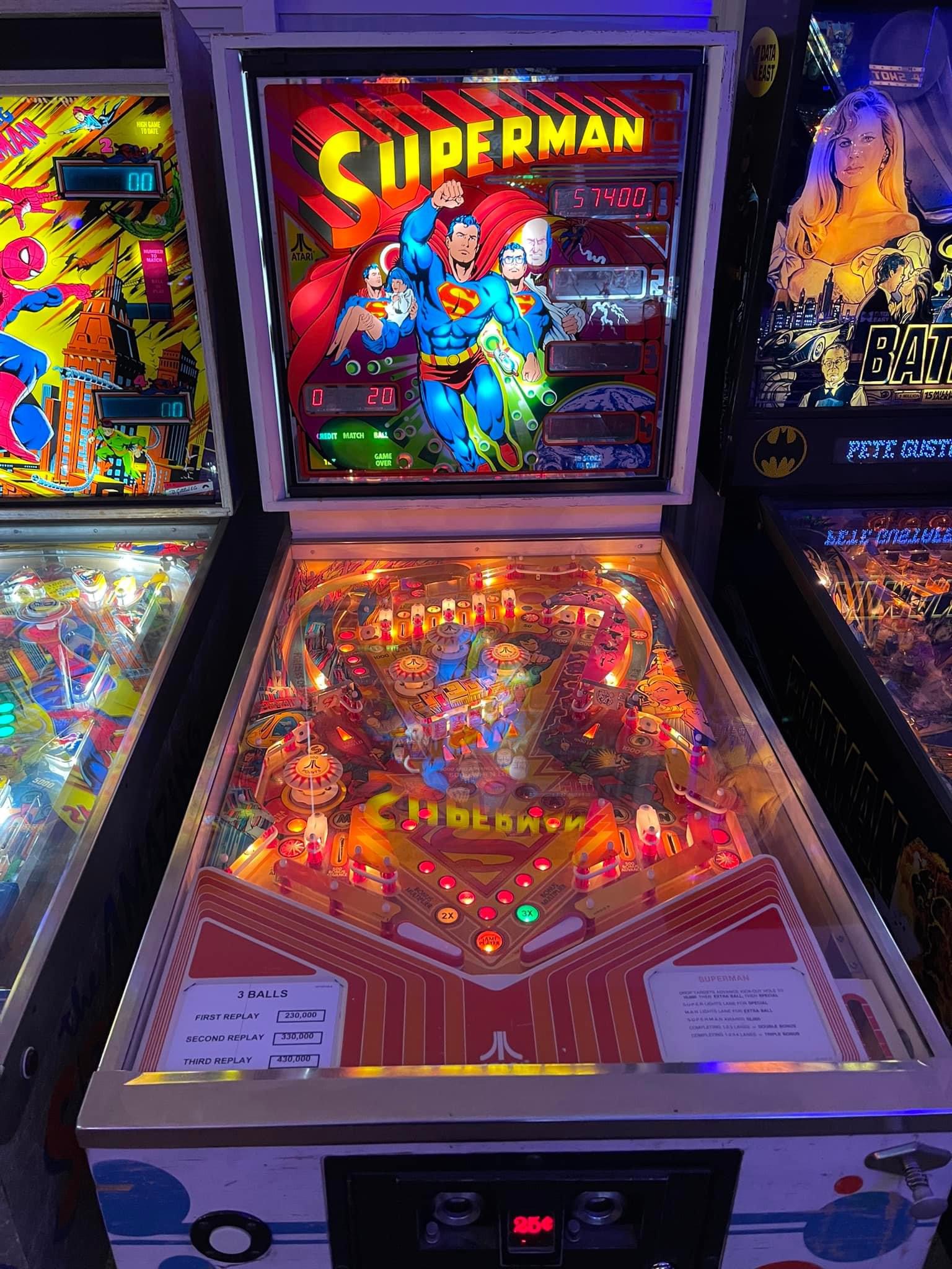 Superman pinball by Atari in 1980. Looks great, works perfectly and has been fitted with many LED’s. Note, LED’s do not function properly in Atari pins in the controlled lighting such as inserts so those have been left with incandescent bulbs. Large widebody pin as all Atari pins were. This is the last Superman pin we have and when it’s gone there’ll be no more, don’t miss this chance.
